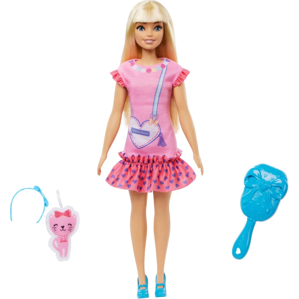 Deze Mijn Eerste Barbie Malibu Roberts pop is speciaal ontworpen voor kleuters. Deze pop van ongeveer 34 cm groot heeft een beweegbaar zacht lijfje en is gemakkelijk aan te kleden. Deze Malibu Roberts pop heeft lang blond haar. Met de grote borstel kunnen kinderen het haar kammen en in model brengen, dit kan helpen om de vingergevoeligheid op te bouwen en de aandacht voor persoonlijke verzorging te stimuleren. De set bevat tevens een pluchen kitten om mee op avontuur te gaan en te inspireren om te koesteren. De kitten stimuleert kinderen om dierenvriendjes te verzorgen. Met een polsbandje dat om de pols van de pop zit, kan Barbie haar zachte vriendje dragen en zo overal mee naartoe nemen. Kinderen kunnen eindeloos verhalen over vriendschap of mode bedenken met deze schattige pop.