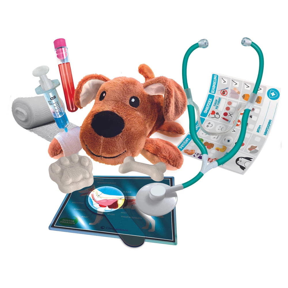 Met het Clementoni dierenartsen in spe spel leer je om zieke dieren te helpen. Verzorg de hond en lap hem weer op.