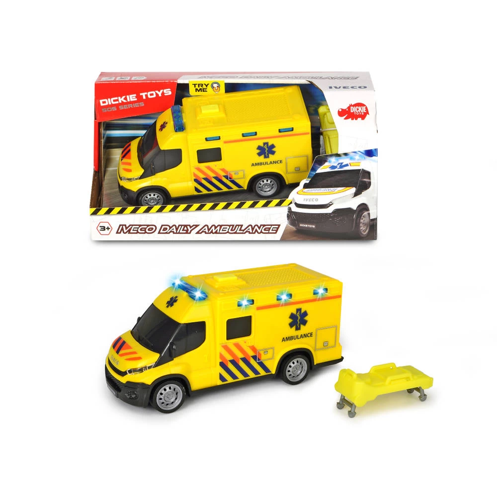 Red levens met deze stoere ziekenwagen Iveco van Dickie Toys. Dit voertuig is voorzien van licht en geluid en is gemaakt op een schaal van 1:32.