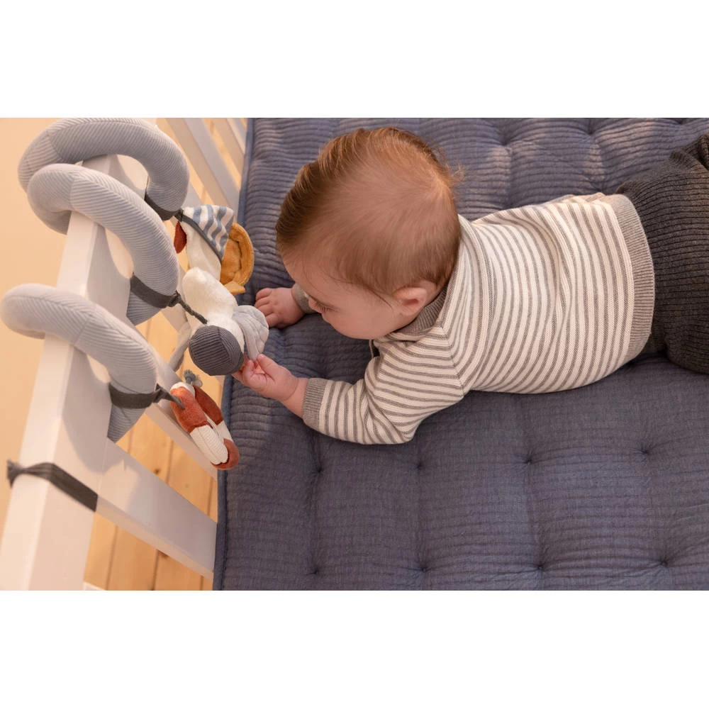 Deze Little Dutch Sailor’s Bay activiteitenspiraal is gemaakt van katoen en corduroy en beschikt over verschillende speeltjes.