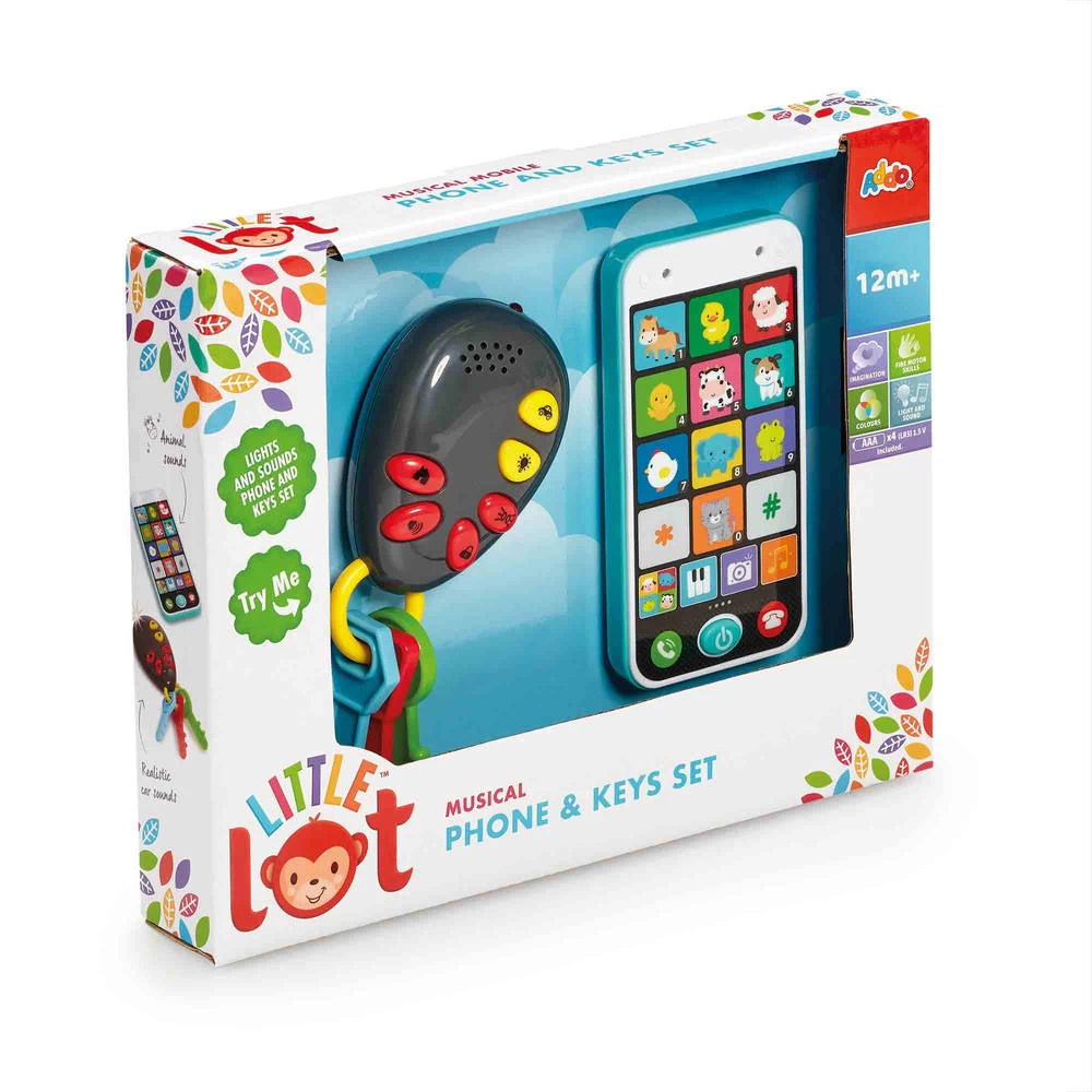 Kinderen beleven urenlang plezier aan het spelen met hun Little Lot muzikale mobiele telefoon en sleutel set. Ontworpen om er echt uit te zien, vinden ze het leuk om volwassenen na te doen. Terwijl ze op de knoppen op de interactieve smartphone drukken, genieten kinderen van een scala aan functies en leuke licht- en geluidseffecten. Tel de tien verschillende dieren op het kleurrijke toetsenbord en druk erop om te horen hoe ze klinken. Welk dier zegt moe, tjirpt en miauwt? Verander vervolgens de modus om echte telefoongeluiden of melodieuze pianogeluiden te activeren. De autosleutels zijn geweldig om volwassenen mee na te bootsen. Rammel met kleurrijke toetsen, druk op de verschillende knoppen om de deur te openen, te toeteren of het licht te laten knipperen. Deze realistische items zijn stimulerende toevoegingen aan de speelgoeddoos van je kind en perfect voor kleine handjes. Met deze set verkennen en genieten kinderen van rollenspel, terwijl ze hun fijne motoriek en coördinatie ontwikkelen en leren over geluiden, kleuren en dieren.