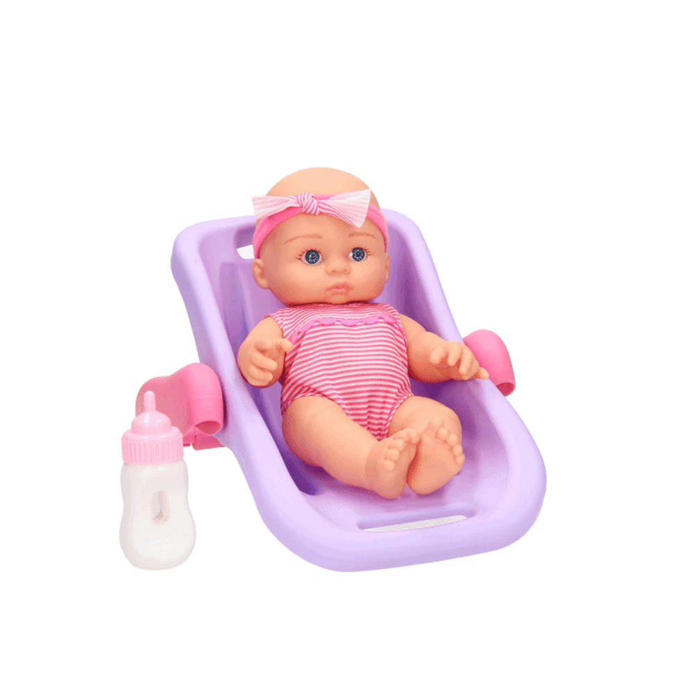 Zet deze lieve babypop in haar draagstoel en neem haar overal mee naartoe. Vergeet haar flesje niet voor wanneer ze honger heeft.