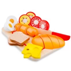Kinderen genieten van heerlijke broodjes, eitjes en fruit met deze mooie New Classic Toys ontbijtset op snijplank.
