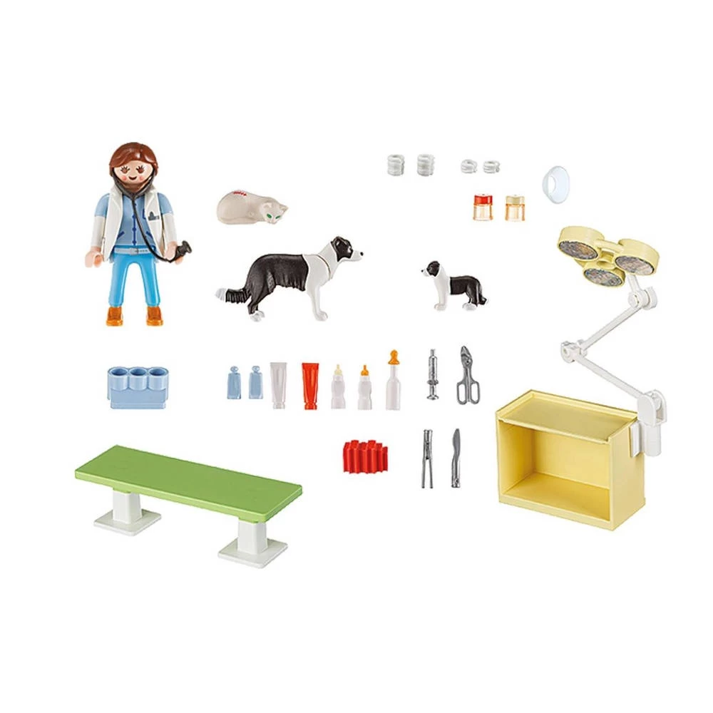 - De set bestaat uit een Playmobil-figuur, twee honden, een kat, onderzoekstafel met lamp, stethoscoop en tal van andere accessoires.