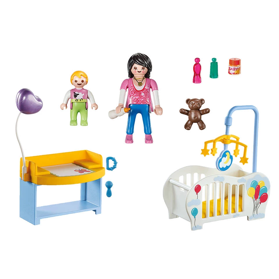 Het is ochtend en mama haalt haar baby uit haar wiegje. Natuurlijk moet haar beertje ook mee! Baby zit op de commode zodat mama haar kan aankleden en kan insmeren met speciale crème. Met deze leuke City Life kinderkamer koffer set van Playmobil kunnen kinderen hun eigen belevenissen verzinnen.