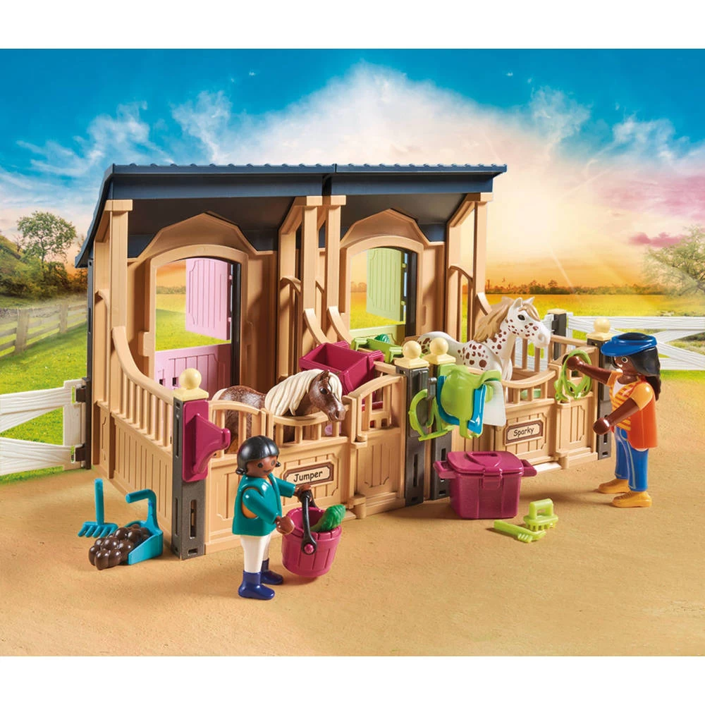- De set bestaat onder andere uit drie Playmobil-figuren, een paard, een pony, een kat, een muis, twee stalboxen, hekelementen, twee poortdeuren, een zadel, een halster en accessoires voor paardenverzorging.