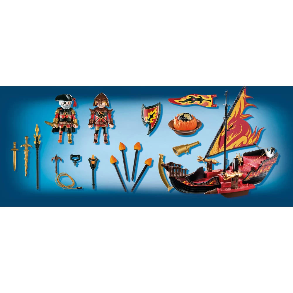 Ga de strijd in met het Playmobil Burnham Raiders vuurschip. De strijd om het magische pantser van de Invincibus gaat door. Maar het avontuur speelt zich niet alleen af op het vasteland. De Burnham Raiders met hun wendbare vuurschip zijn ook extreem gevaarlijk op het water. Als een vijand nadert, worden de kanonnen snel in stelling gebracht. Als het schip in de buurt komt, strekken de ingenieuze Burnham Raiders hun boegsikkel uit en gebruiken ze deze als grijphaak. Aan boord van het schip heeft heethoofd Bayron Burnham de leiding. De pyromaan-krijgsheer bestudeert momenteel het magische kompas om de coördinaten van de Invincibus te achterhalen. Zal het kompas de Burnham Raiders naar hun bestemming leiden? De speelset bevat de leider van de Burnham Raiders, Bayron Burnham en Archibald Blazebow, een vuurschip met afvurende kanonnen, vliegerzeilen en een magisch kompas. De sikkel op de boeg van het schip kan worden gebruikt als rambescherming of grijphaak. Het schip kan worden opgewaardeerd met een onderwatermotor.