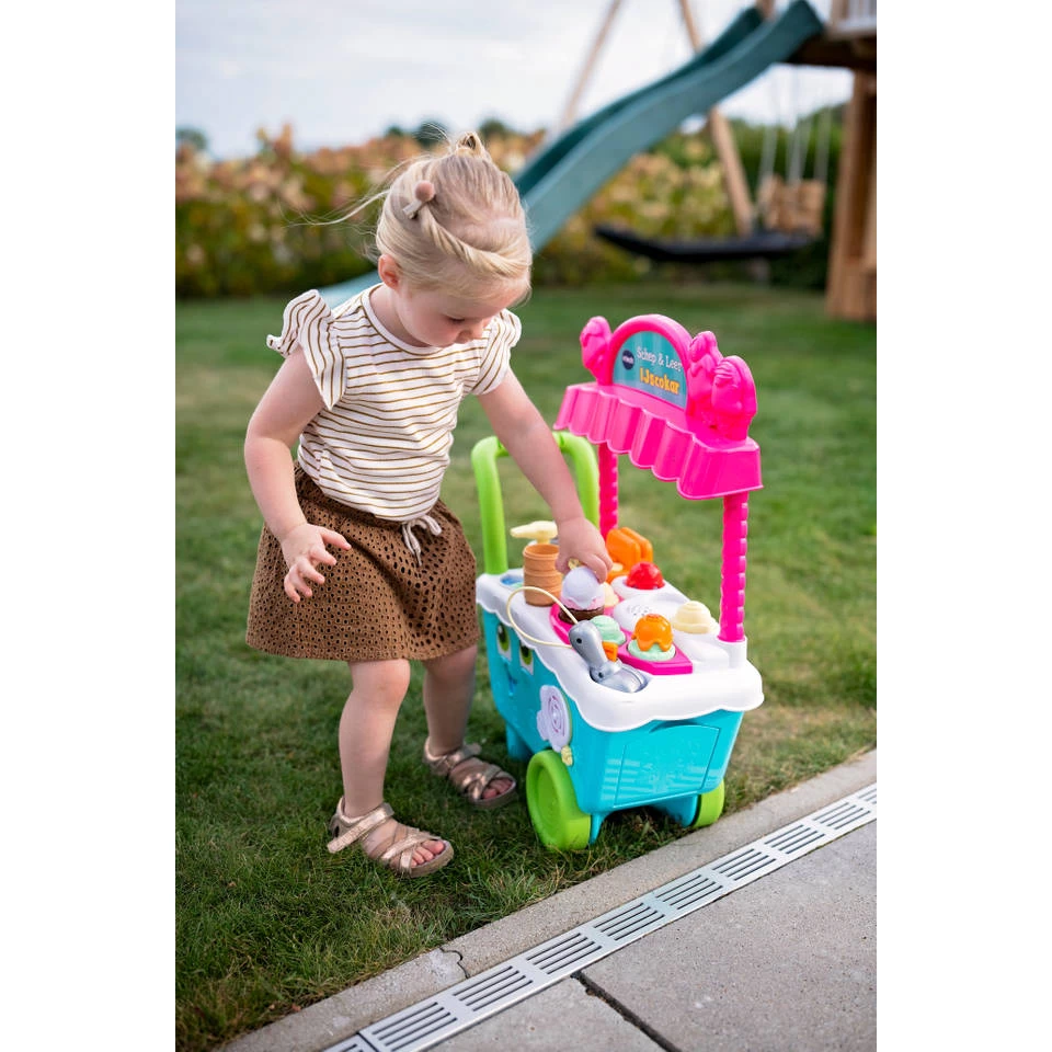 Word de beste ijsverkoper met deze Schep & Leer ijscokar! De interactieve ijslepel herkent op magische wijze de verschillende smaken en toppings. Plaats één van de zes dubbelzijdige kaarten in de kassa en maak de bestellingen voor de dieren klaar. Of speel grappige spelletjes en leer tellen, kleuren, smaakjes en nog meer. Met vier vrolijke melodietjes en zes gezongen liedjes. Gebruik je fantasie en maak de lekkerste ijscreaties.